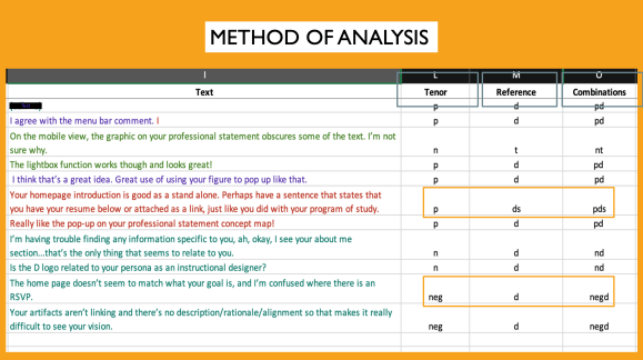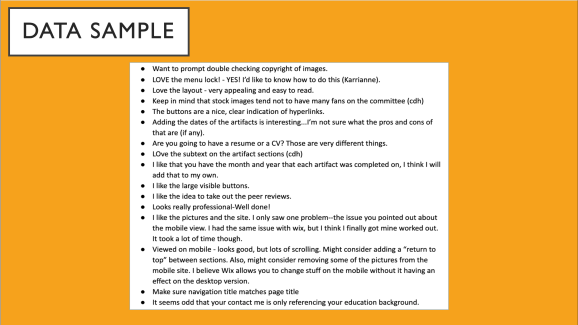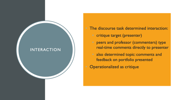 Please see the brief presentation below. This research project used methods of discourse analysis to look at the communication interaction between beginning design students and design students nearly finished with their degree program critiquing one another’s portfolios in their respective degree initiative and capstone courses. The essential aim of the research is learner progression and measurement of learning throughout the program as related to design knowledge, critiquing capabilities, design problem-solving skills, and communicative nuance and clarity within a community of practice.